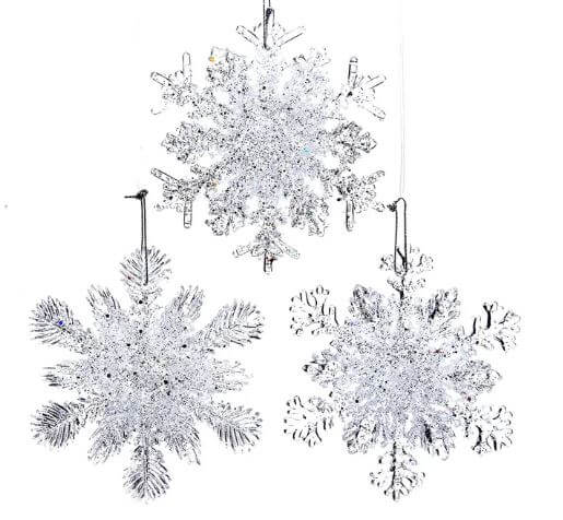 This assortment comes with three differently designed clear frosted snowflakes. Each of the ornaments are accented with laser glitter which make them guaranteed to catch anyone’s eye!