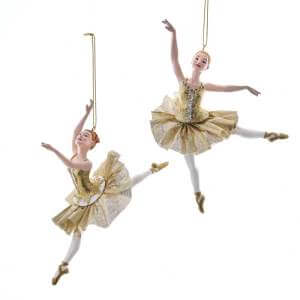 This assortment features two ballerinas dressed in metallic gold with gold ballerina shoes. Choose one: arabesque or 2nd position.